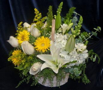 Yellow daisies, white roses, solidago, white hydrangeas, white snapdragons, and foliage accents designed in a woven basket.
