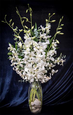 White orchids with foliage accents designed in a clear glass vase with river rock accents.