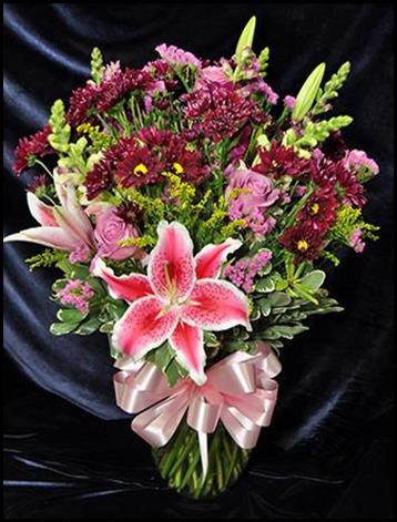 Lilies, purple daisy pompoms, statice, roses, snapdragons, solidago, and foliage accents designed in a clear glass vase.