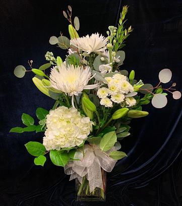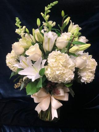 All white floral arrangement with hydrangeas, chrysanthemums, snapdragons, tiger lilies, and foliage accents designed in a clear glass vase.