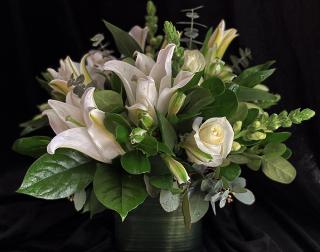 A versatile compact arrangement of in all white with lilies, snapdragons, roses, alstroemeria, and foliage accents including eucalyptus designed in a leaf-lined vase.